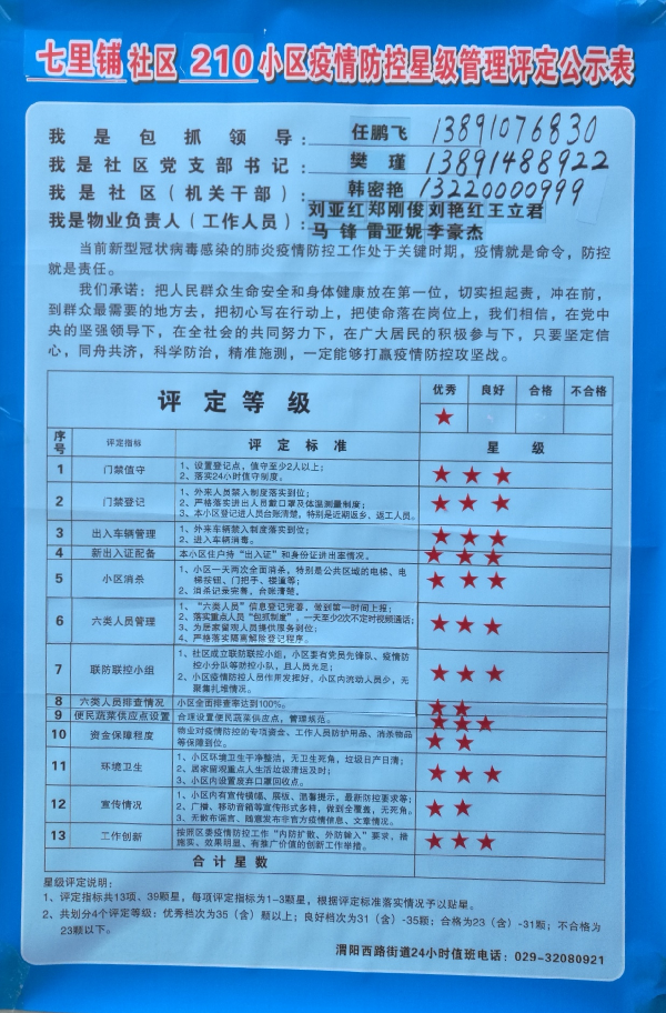 經(jīng)過秦都區(qū)政府相關(guān)部門檢查及社區(qū)測評,核昌公司生活區(qū)的疫情防控工作受到了地方政府的肯定和好評。在社區(qū)“小區(qū)疫情防控星級管理評定公示欄”獲得優(yōu)秀評級。成績的取得歸功于組織的正確領(lǐng)導(dǎo)、一線同志的不懈擔(dān)當(dāng)和全體核昌人的共同努力。
